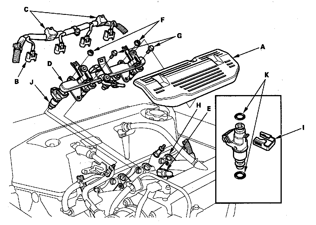 5. Remove the retainer nuts (F) and bolts (G) from the fuel rail.