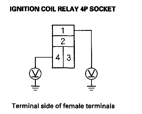 3. Measure the voltage between ignition coil relay 4P socket terminal No. 1 and body ground, then terminal No. 4 and body ground.