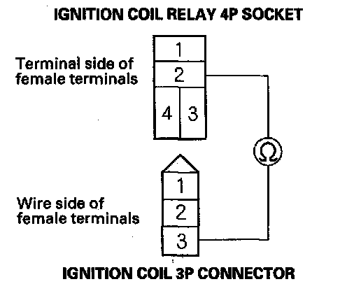 4. Check for continuity between each ignition coil relay 4P socket terminal No. 2 and ignition coil 3P connector terminal No. 3.
