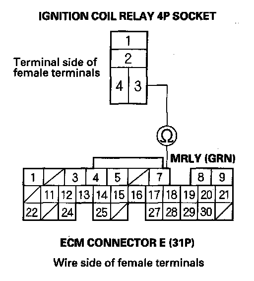 NO - Repair open in the wire between ignition coil relay 4P socket terminal No. 3 and the ECM (E7).