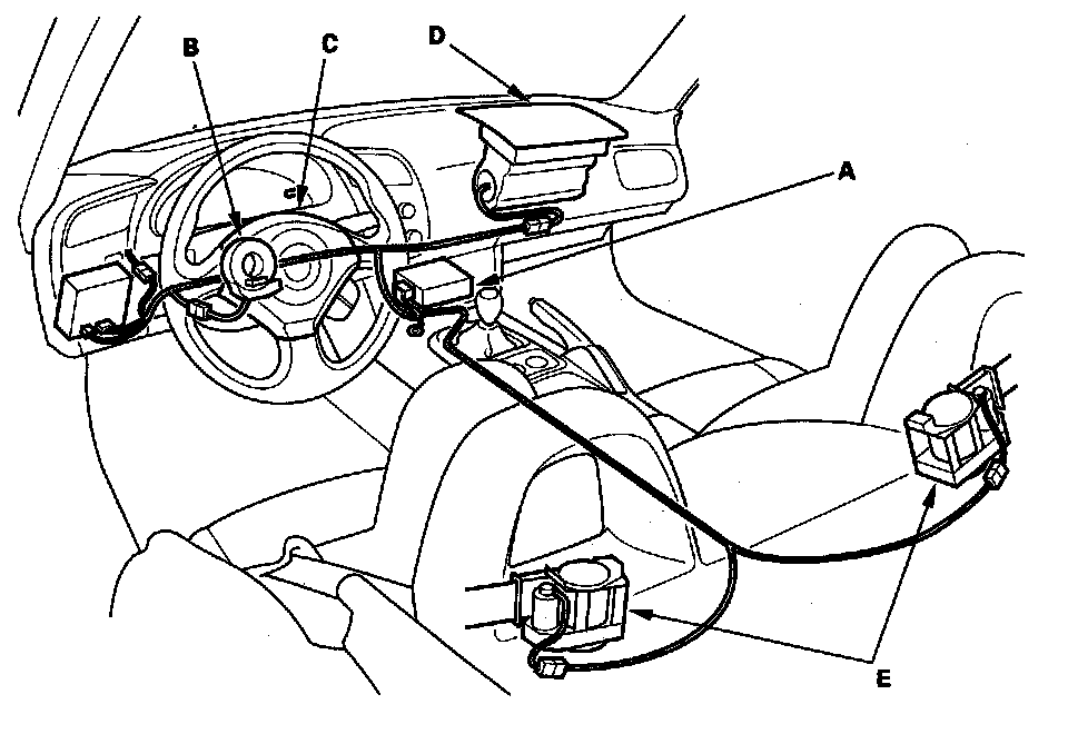 The SRS is a safety device which, when used with the seat belt, is designed to help protect the driver and passenger in a frontal impact exceeding a certain set limit. The system consists of the SRS unit, including a safing sensor and an impact sensor (A), the cable reel (B), the driver's airbag (C) and the passenger's airbag (D).