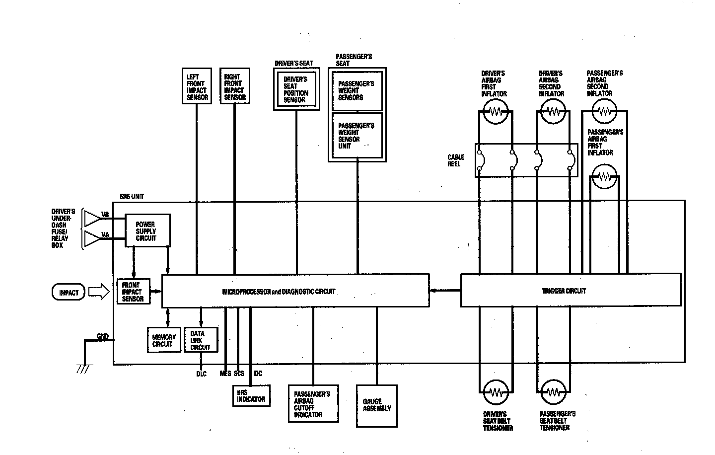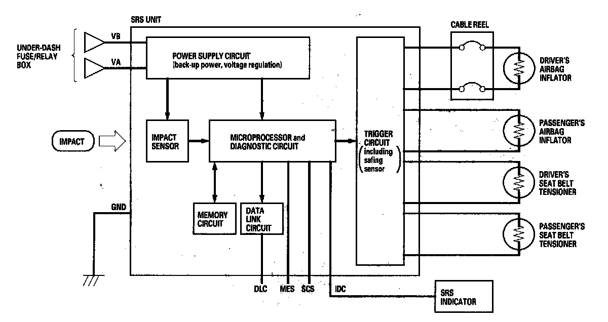 The main circuit in the SRS unit senses and judges the force of impact and, if necessary, ignites the inflator charges. If the battery voltage is too low or power is disconnected due to impact, the voltage regulator and the back-up power circuit respectively will keep voltage at a constant level.