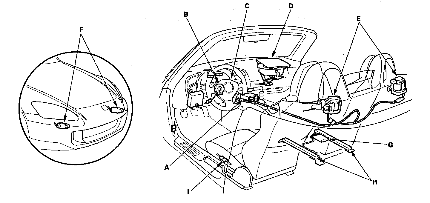 The driver's seat position sensor (I) is under the driver's seat on the left side. When the driver's seat is moved to its full forward position, the deployment of the driver's airbag is moderated to decrease its force of impact during a front-end collision.
