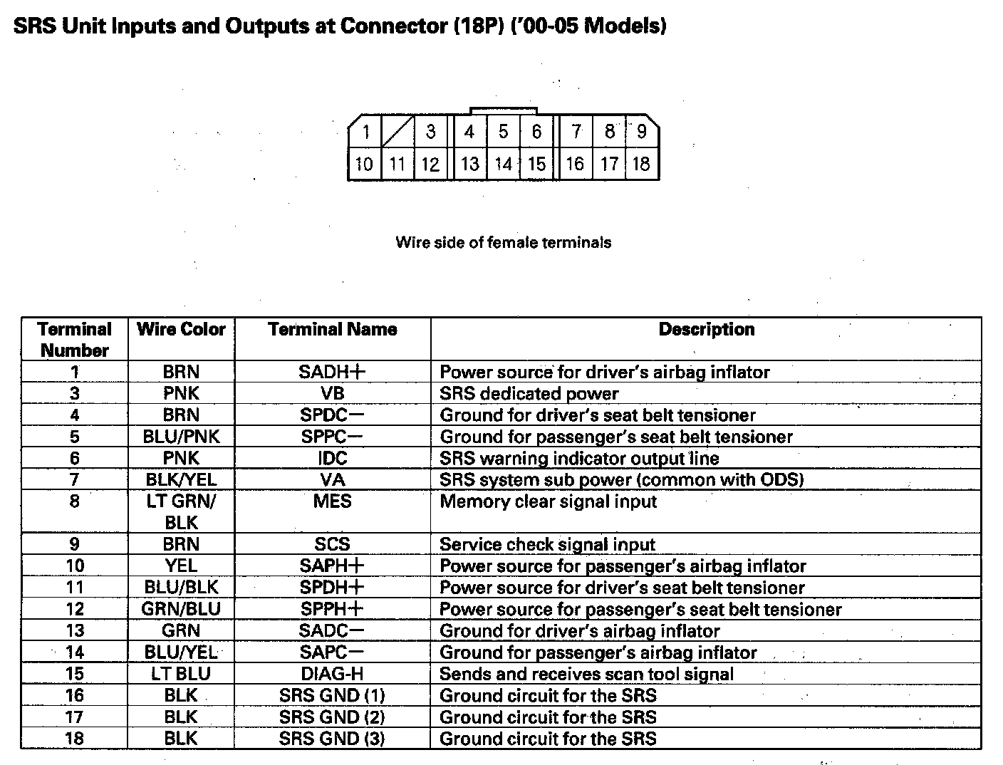 SRS Unit inputs and Outputs at Connector (18P) ('00-05 Models)
