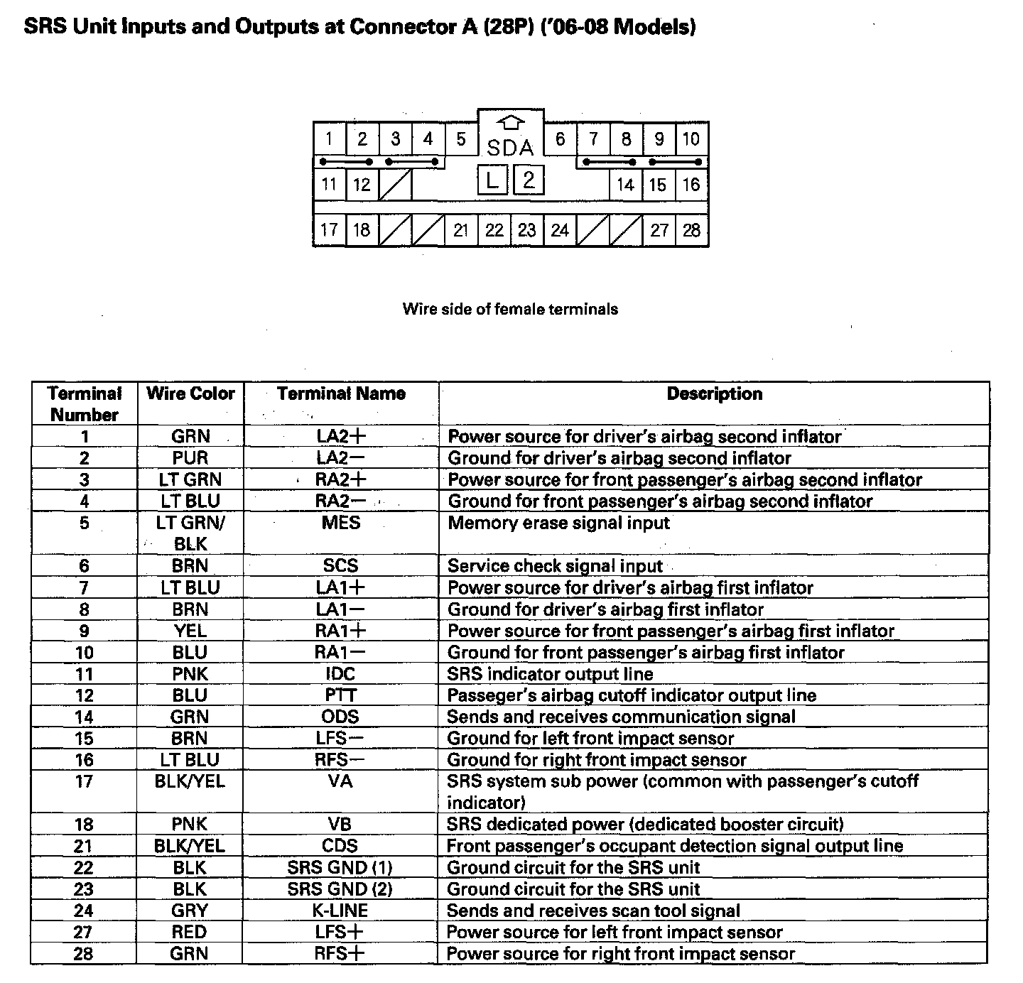 SRS Unit inputs and Outputs at Connector A (28P) ('06-08 Models)