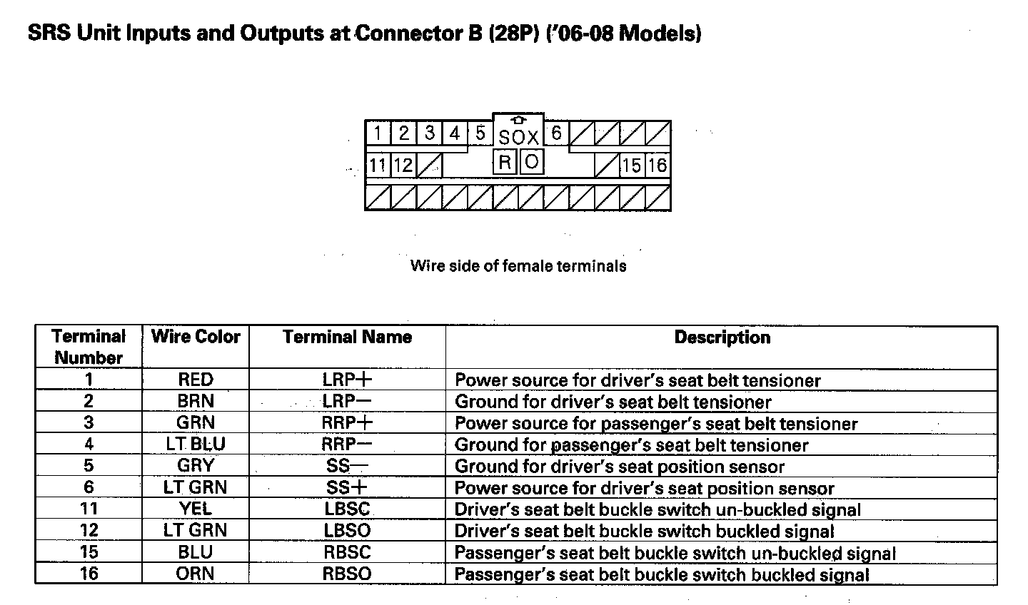SRS Unit inputs and Outputs at Connector B (28P) ('06-08 Models)