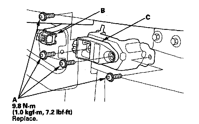 1. Install the front impact sensor with new TORX bolts (A), then connect the engine compartment wire harness 2P connector (6) to the front impact sensor (C).