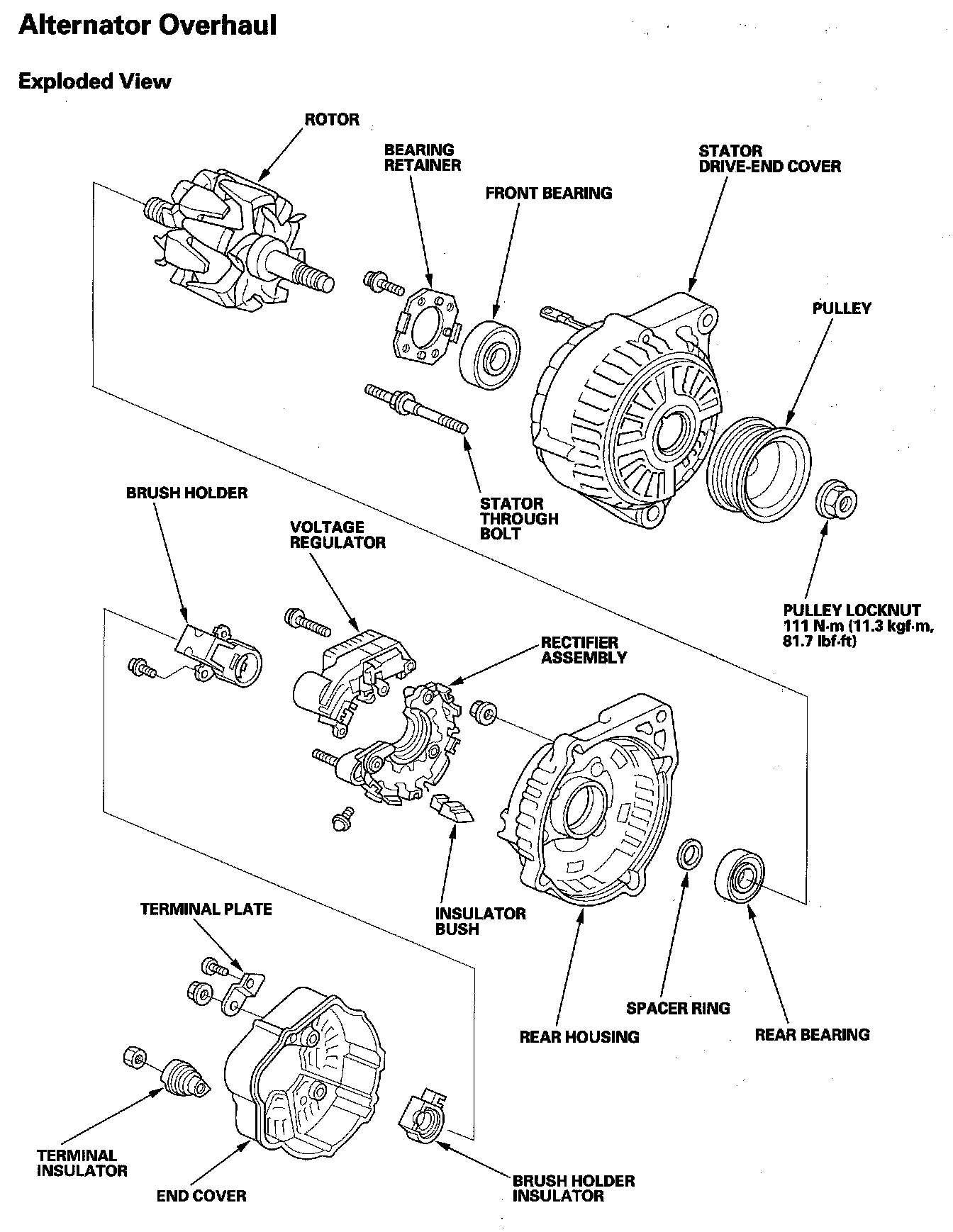 24. Reassemble the alternator in the reverse order of disassembly, and note these items: