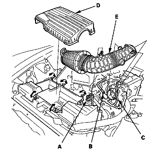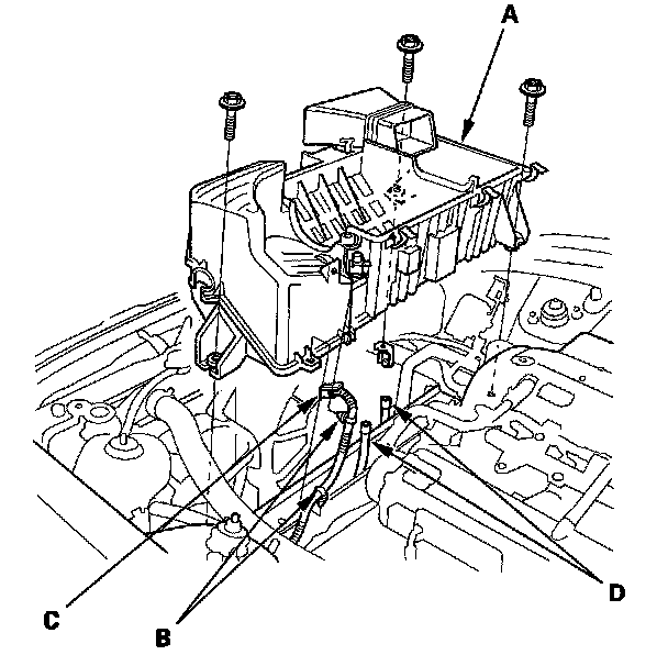 5. '00-05 models: Disconnect the air control solenoid valve connector (A) and vacuum hoses (B), remove the harness clamps (C), then remove the intake air cleaner housing (D).