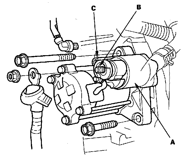 10. Disconnect the starter cable from the B terminal on the starter solenoid (A), then disconnect the BLK/WHT wire from the S terminal (C).