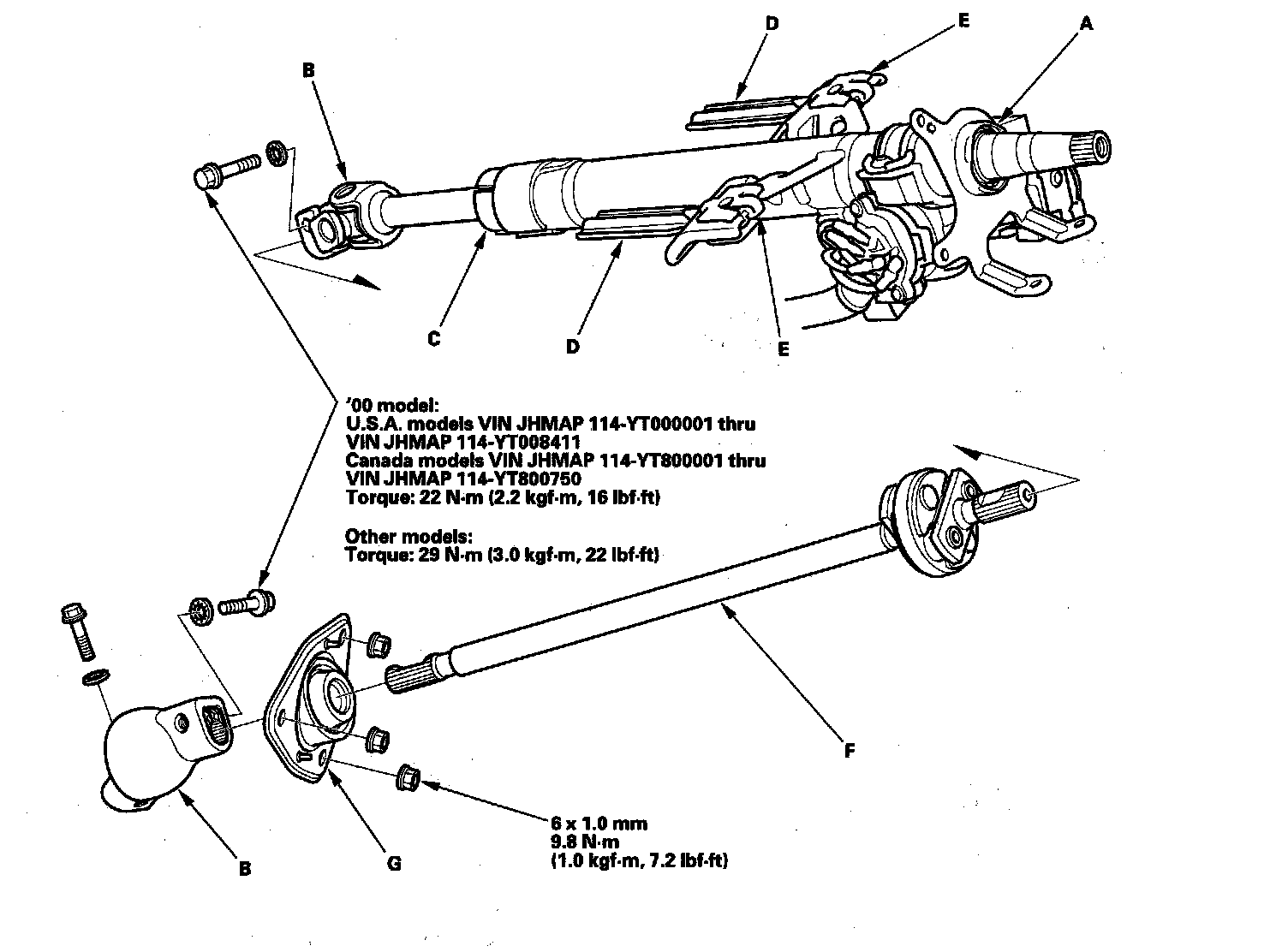 ^ Check the sliding capsules (E) for distortion or breakage. If there is distortion or breakage, replace the steering column as an assembly.