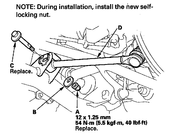 3. Remove the self-locking nut (A), adjusting cam plate (B), and adjusting bolt (C), then disconnect the control arm (D) from the frame.