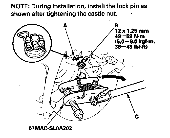 ^ Torque the castle nut to the lower torque specification, then tighten it only far enough to align the slot with the ball joint pin hole. Do not align the castle nut by loosening it.