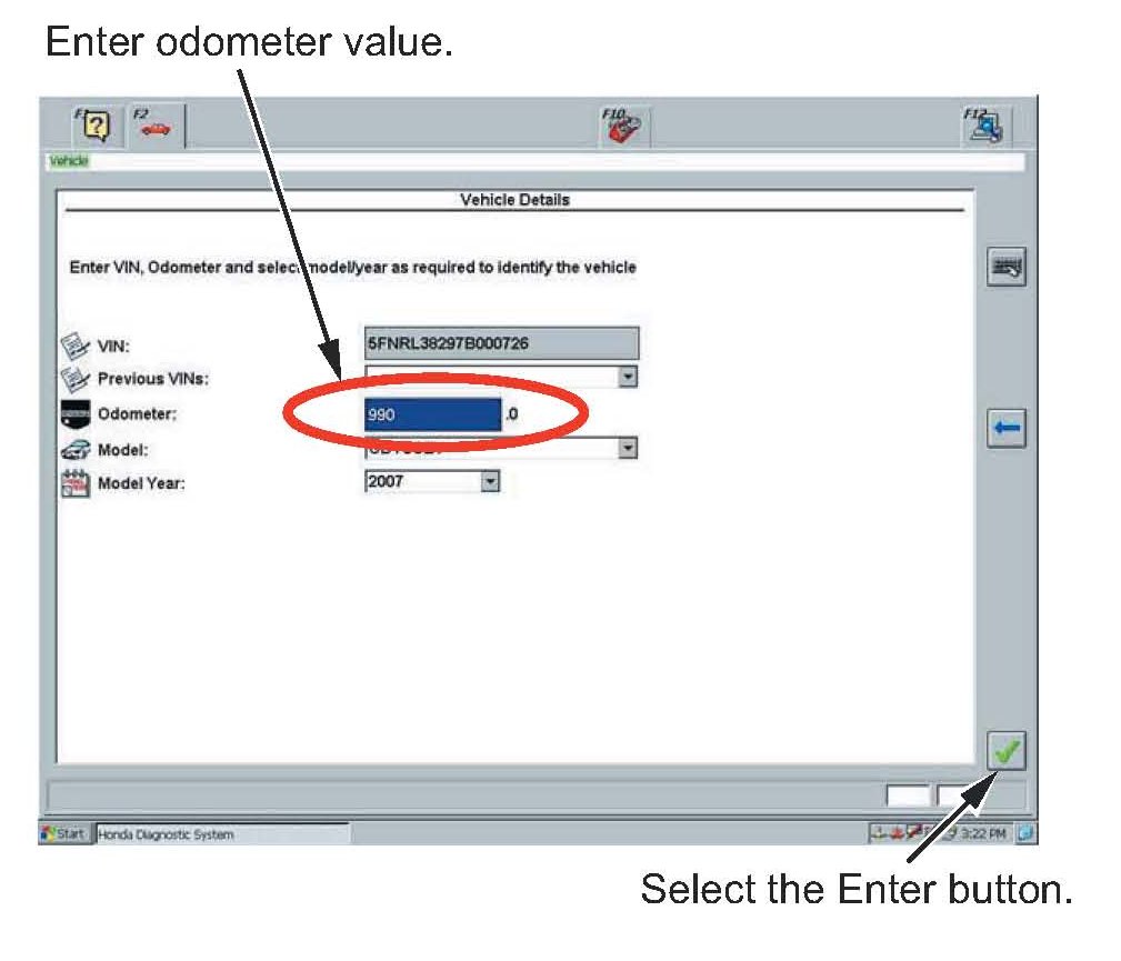5. The VIN information appears automatically, but you must enter the mileage, and select the Enter button.