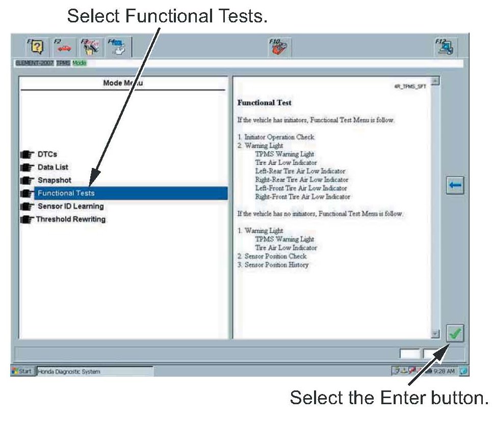 8. In the Mode menu, select Functional Tests, then select the Enter button.