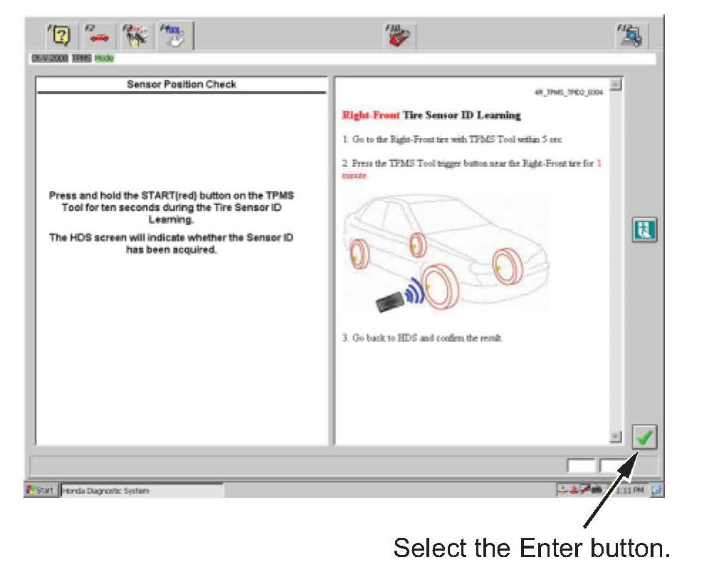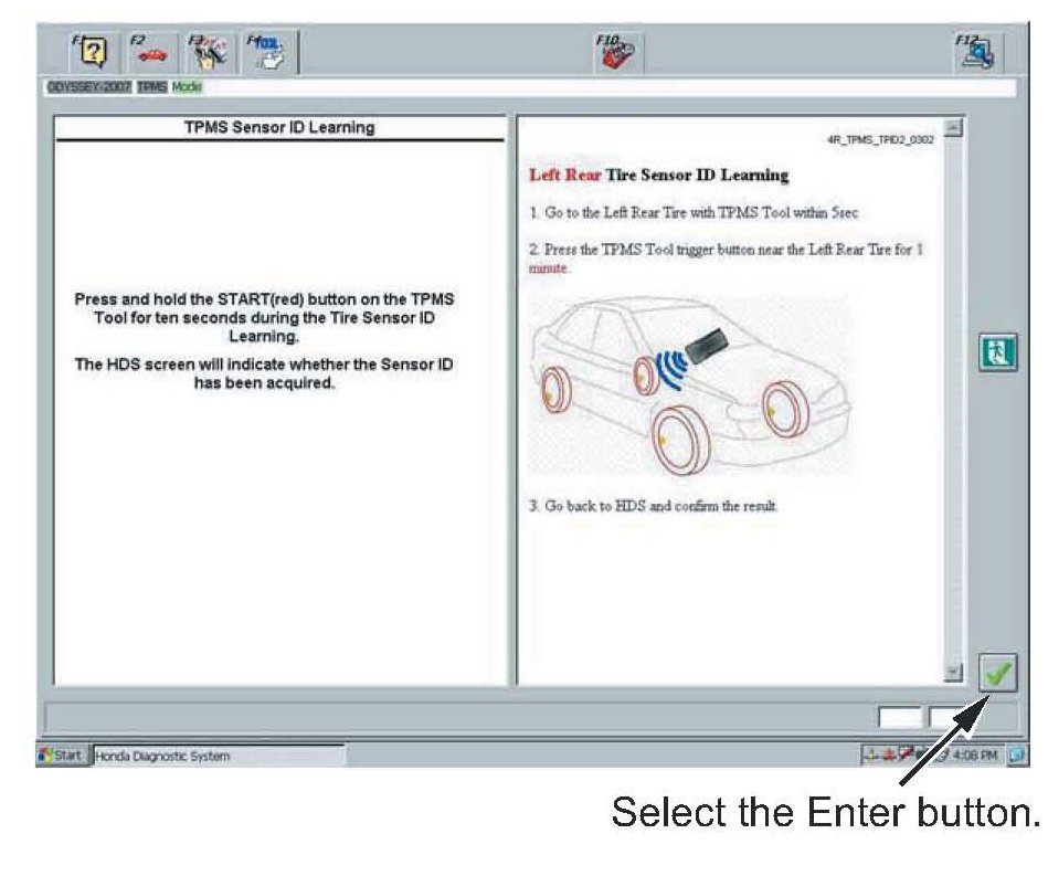 11. Follow the instructions on the TPMS Sensor ID Learning screen. When prompted, go to the left front wheel, then select the Enter button.