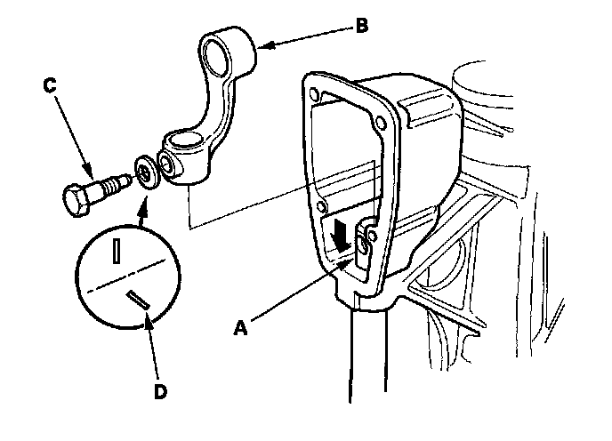 2. Lower the shift rod (A), then remove the 8 mm special bolt (C), the conical spring washer (D), and shift arm B.