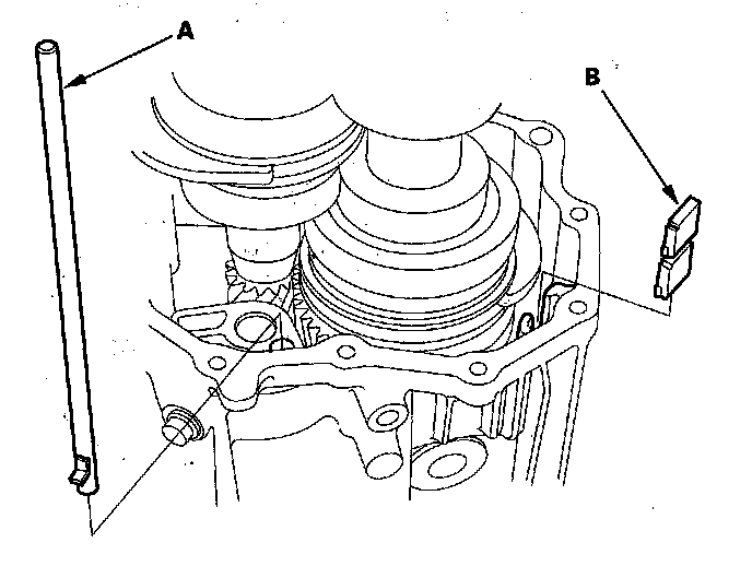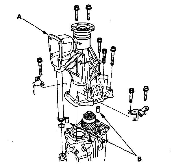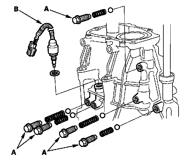 9. Remove the set screws (A), springs, steel balls, the back-up light switch (B), and washer.