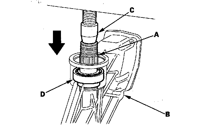 8. Remove the 27 mm locknut (A), the spring washer (B), the back-up ring (C), and the O-ring (D).