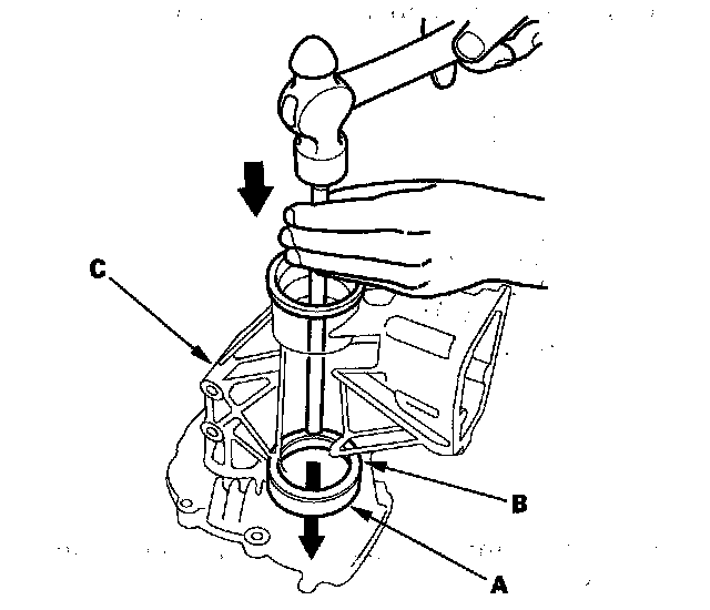 11. Remove the secondary shaft (A) from the rear cover (B) using a press (C) as shown.