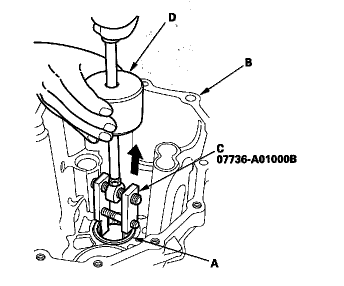 14. Remove the bearing outer race (A) from the rear cover (B) using the 20 - 40 mm adjustable bearing puller (C) and commercially available 3/8"-16 UNF slide hammer (D).