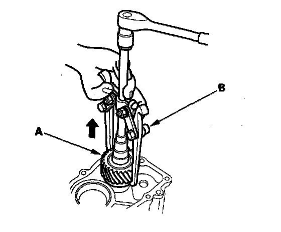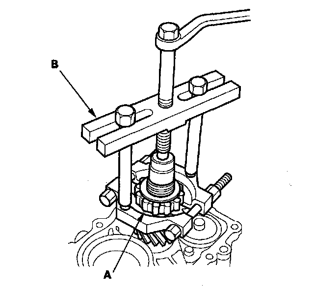 6. Remove the secondary drive gear (A) using a commercially available bearing puller (B) as shown.