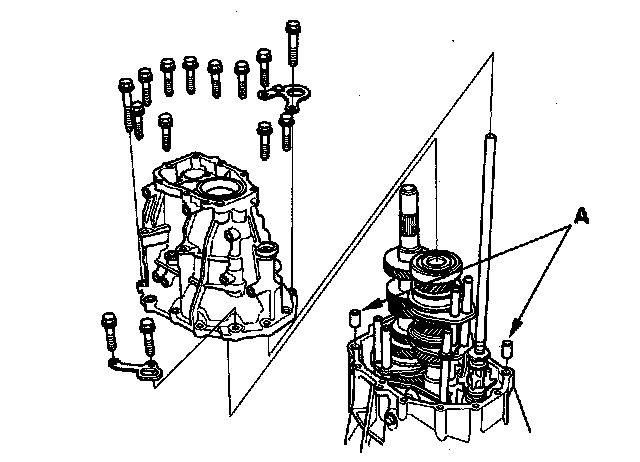 11. Remove the transmission housing and the 14 x 20 mm dowel pins (A).