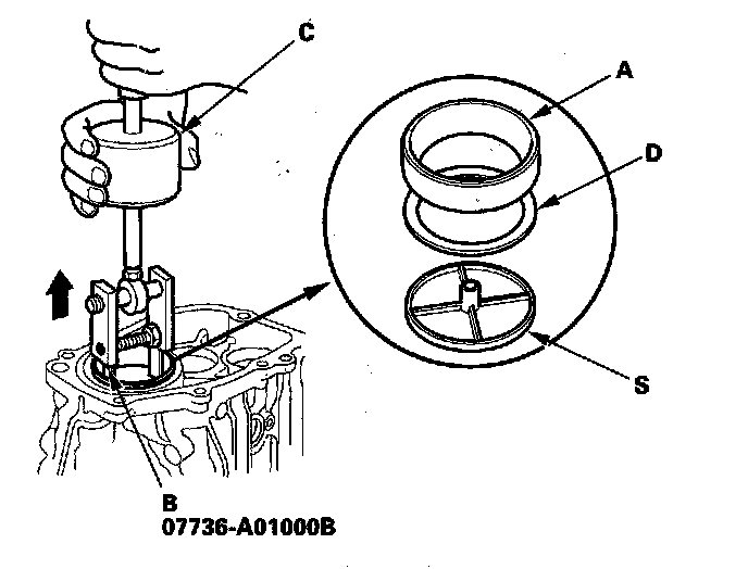 12. Remove the bearing outer race (A) using the 20 - 40 mm adjustable bearing puller (B) and commercially available 3/8"-16 UNF slide hammer (C), then remove 82 mm shim (D) and oil guide plate S.