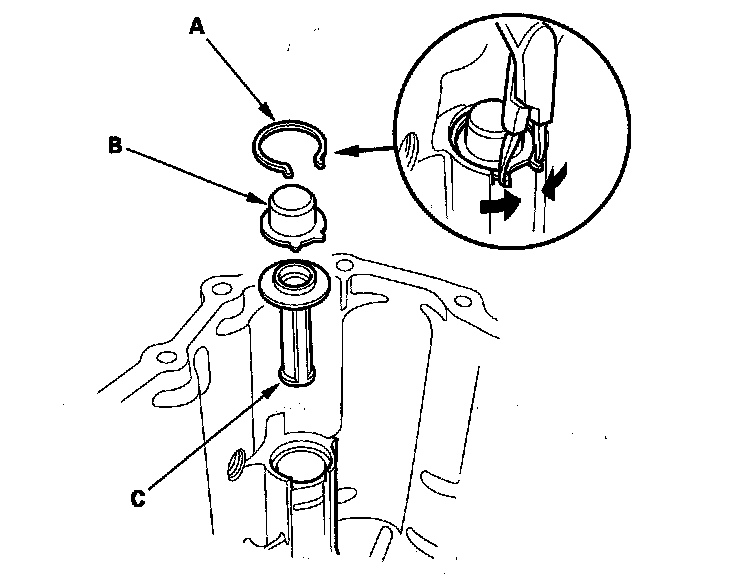 14. Remove the circlip (A), then remove the suction guide (B) and the oil pump strainer (C) from the transmission housing.