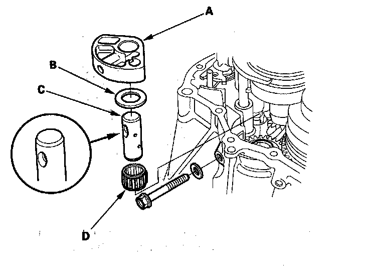 17. Remove the 8 mm flange bolt and washer, then remove the reverse shaft holder (A), the thrust washer (B), the reverse gear shaft (C), and the needle bearing (D).