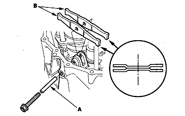 7. Remove the 6 mm flange bolts, then remove the oil pump plate (A), spring, steel ball, and oil pump rotors (B).