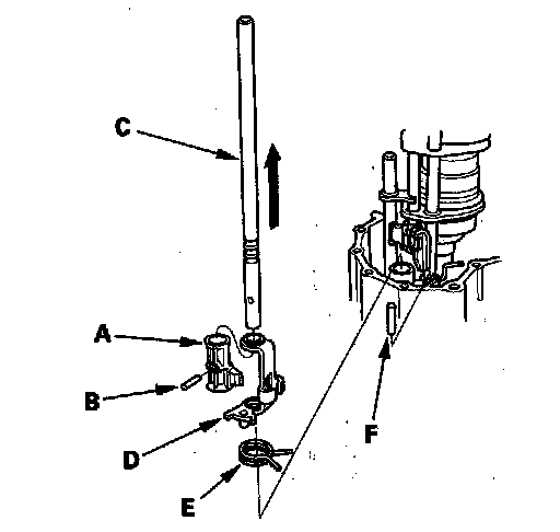 20. Remove shift arm A from the interlock (D), then remove the select return spring (E) and the 8 x 40 mm pin (F).