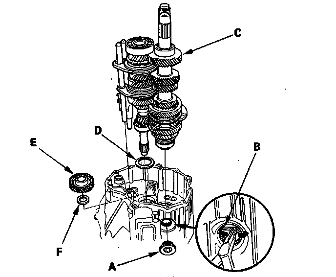24. Remove the mainshaft, countershaft, and the shift forks assembly (C), and remove the 64 mm spring washer (D), the reverse idler gear (E), and thrust washer (F).