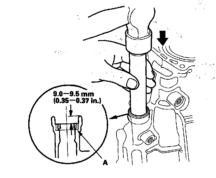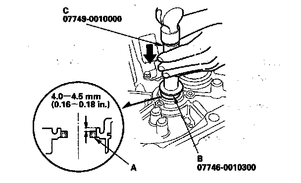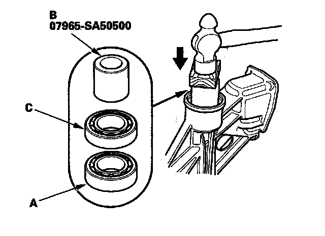 4. Install the new ball bearing (A) using the 35 mm I.D. attachment (B) and the old bearing (C).