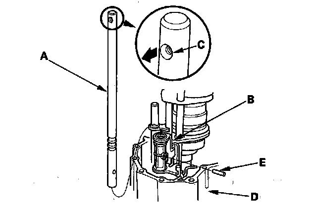 9. Install the shift rod (A) into the interlock assembly (B) with the recessed hole (C) toward the top of the clutch housing (D), then install the 5 x 25 spring pin (E).