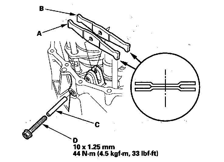 11. Install the 8 x 63 pin (C), then tighten the 10 mm flange bolt (D).
