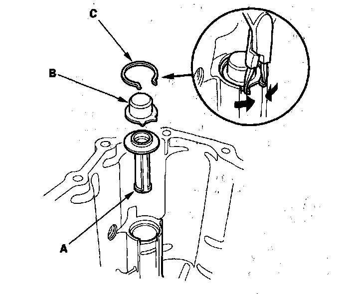 15. Install the oil pump strainer (A), the suction guide (B), and the circlip (C).