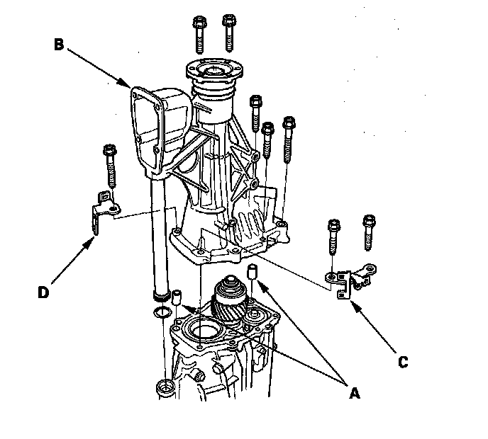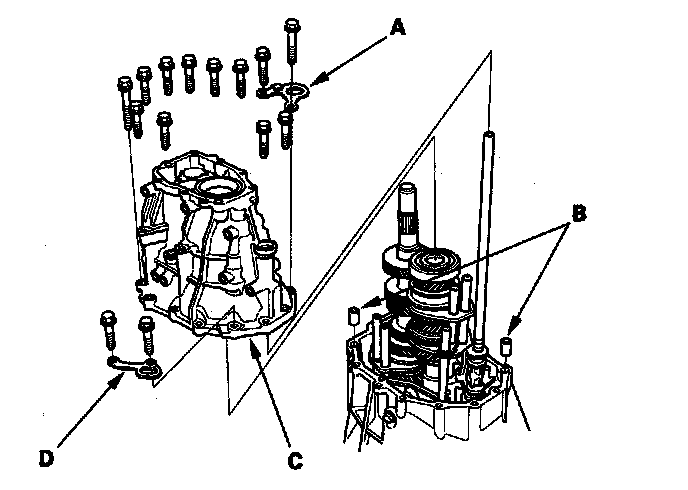 19. Install the 14 x 20 dowel pins (B), the transmission housing (C), 8 mm flange bolts, the transmission hanger (D), and transmission hanger A.