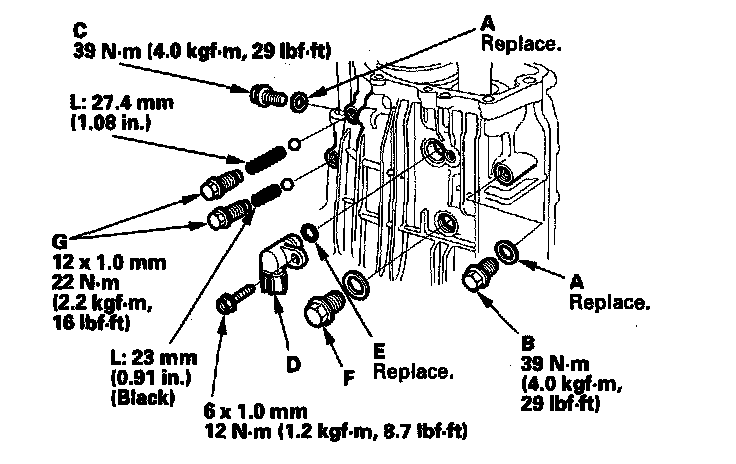 23. Install the new washers (A), the drain plug (B), the 12 mm drain plug (C), and the vehicle speed sensor (VSS) ('00-05 models) or the output shaft (countershaft) speed sensor ('06-08 models) (D) with a new O-ring (E). Install the filler plug (F) finger-tight.