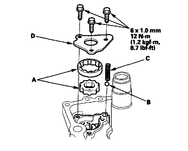 25. Install the oil pump inner and outer rotors (A), the steel ball (B), the spring (C), and the oil pump plate (D).