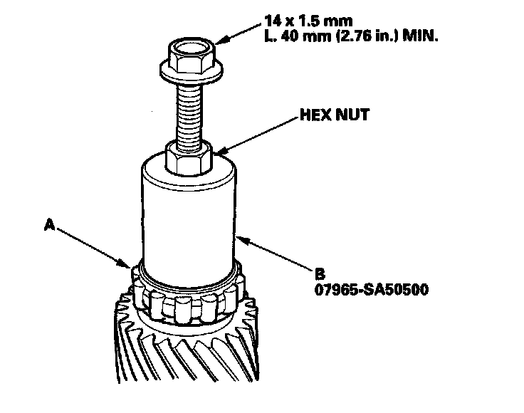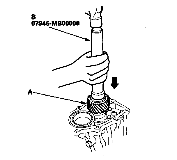 26. Install the secondary drive gear (A) on the countershaft using the 30 mm I.D. driver (B) as shown.