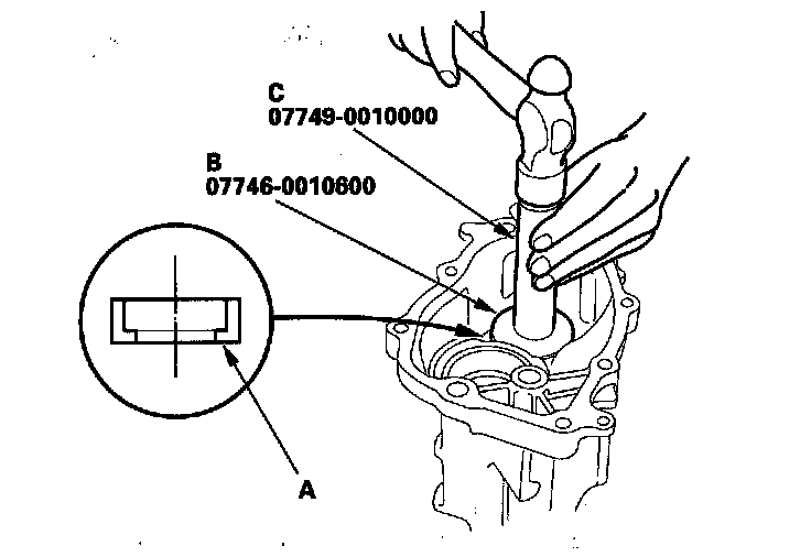 1. Install the oil seal (A) using the 42 x 47 mm attachment (B) and driver (C).