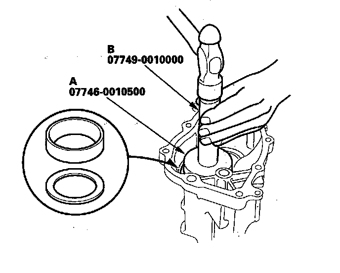 2. Install the shim and the bearing outer race into the rear cover using the 62 x 68 mm attachment (A) and driver (B) as shown.