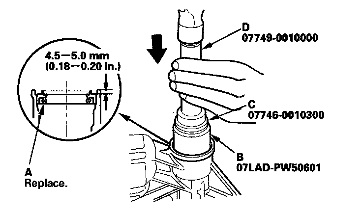 5. Install the new oil seal (A) using the 40 x 50 mm I.D. attachment (B), 42 x 47 mm attachment (C), and driver (D).