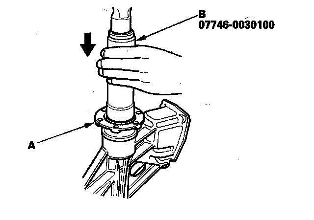 27. Install the needle bearing (A) on the countershaft using the 35 mm I.D. attachment (B) as shown.