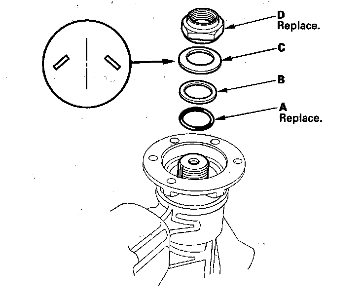 7. Install the new O-ring (A), the back-up ring (B), the spring washer (C), and the new 27 mm locknut (D).