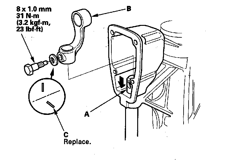 14. Lower the shift rod (A), then install the shift arm B, the new conical spring washer (C), and 8 mm special bolt.