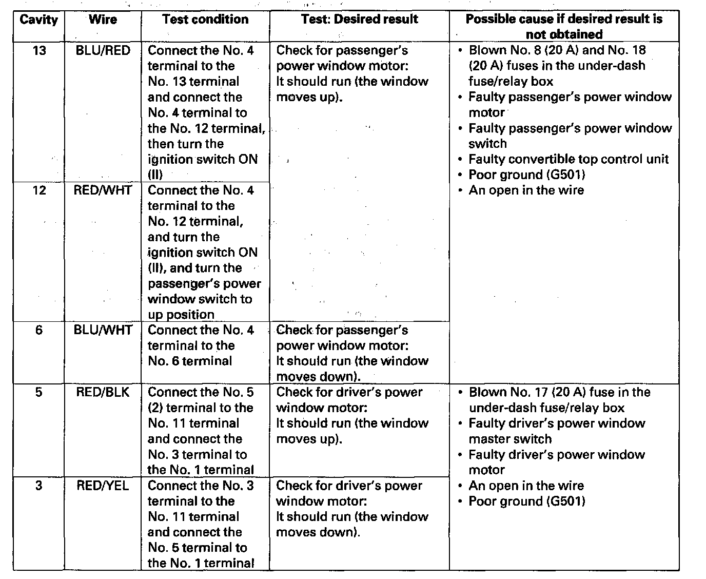 5. Reconnect the power window master switch, and perform the following input tests at the 14P connector.