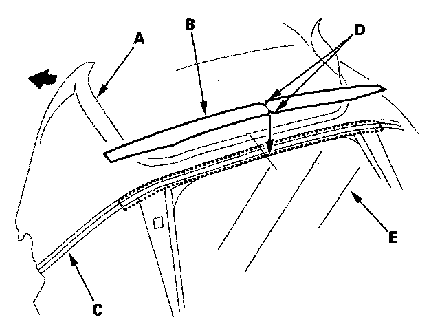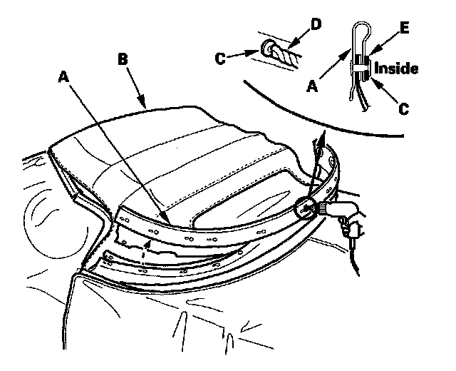 20. Turn the convertible top cloth (A) inside out, and apply a new patch (B) on the zipper (C). Make sure the alignment notches (D) align with the middle of the rear window (E).