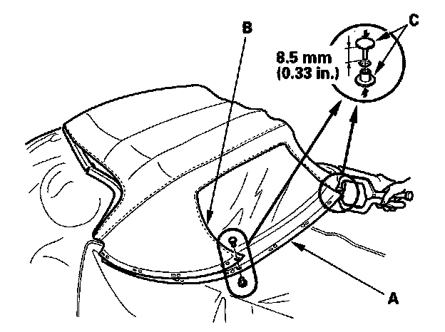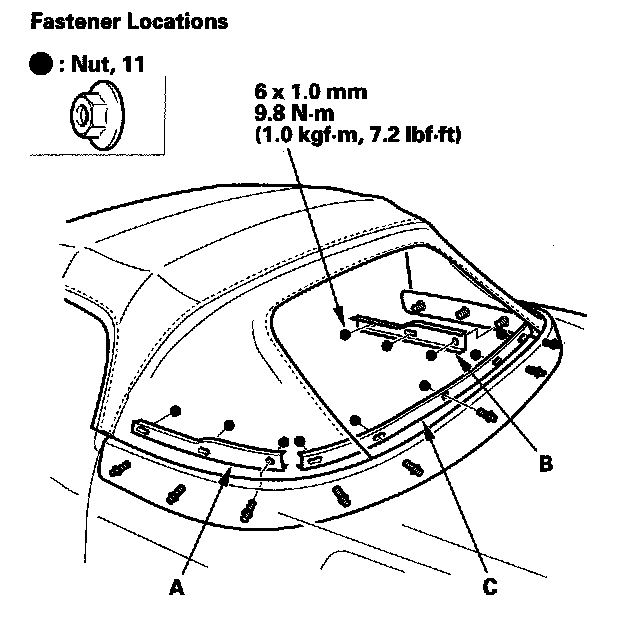9. Remove the nuts, then remove the rear lower convertible top retainer (A), right side convertible top retainer (B), and left side convertible top retainer (C).